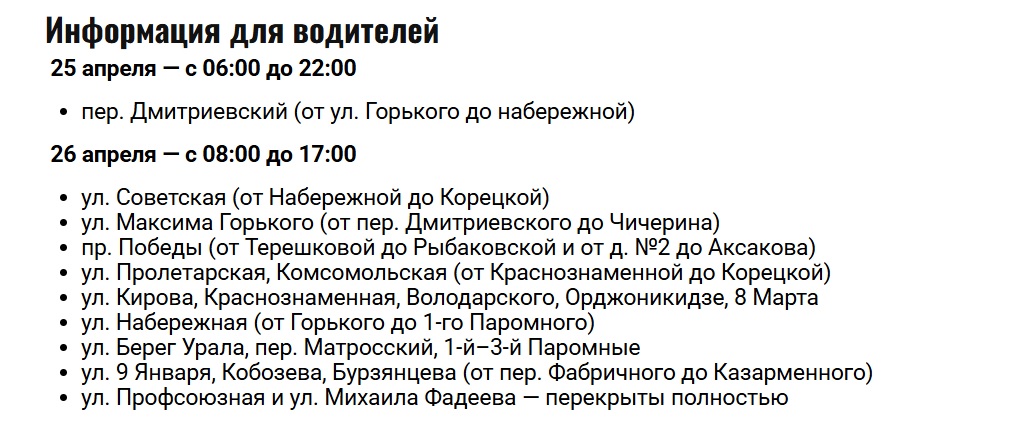 Дороги будут перекрыты с 08:00 до 17:00, на время проведения массовых мероприятий в центре города. Водителей Оренбурга просят выбирать объездные пути.