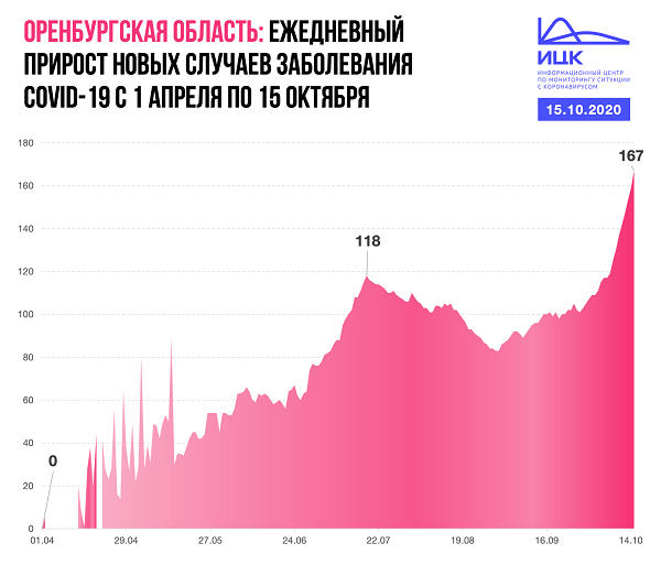 По данным федерального штаба, в Оренбургской области в течение месяца суточный прирост заболевших резко подскочил. На 15 сентября за сутки было зафиксировано 100 новых случаев, к 15 октября эта цифра составила 167.