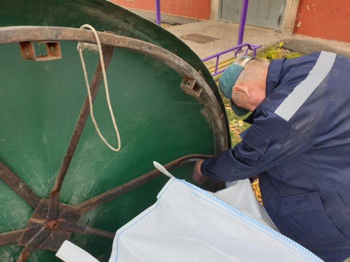 За два часа работы собрано и вывезено около 40 куб. м отходов, демонтированы разорванные и установлены новые мешки в заглубленные контейнеры. Стоит отметить, что предоставленные муниципалитетом мешки имеют средний порог прочности и при выбрасывании в контейнер тяжелых или острых отходов могут быстро прийти в негодность.
