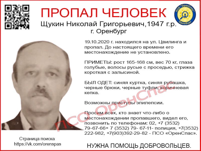 Всех, кто что-либо знает о местонахождении пропавшего или видел его, просят позвонить по телефонам: 02, +7 (3532) 79-67-66+ 7 (3532) 79- 67-11- полиция, +7(3532) 222-982, +7(903)392-29-82 — ПСО «ОренСпас».