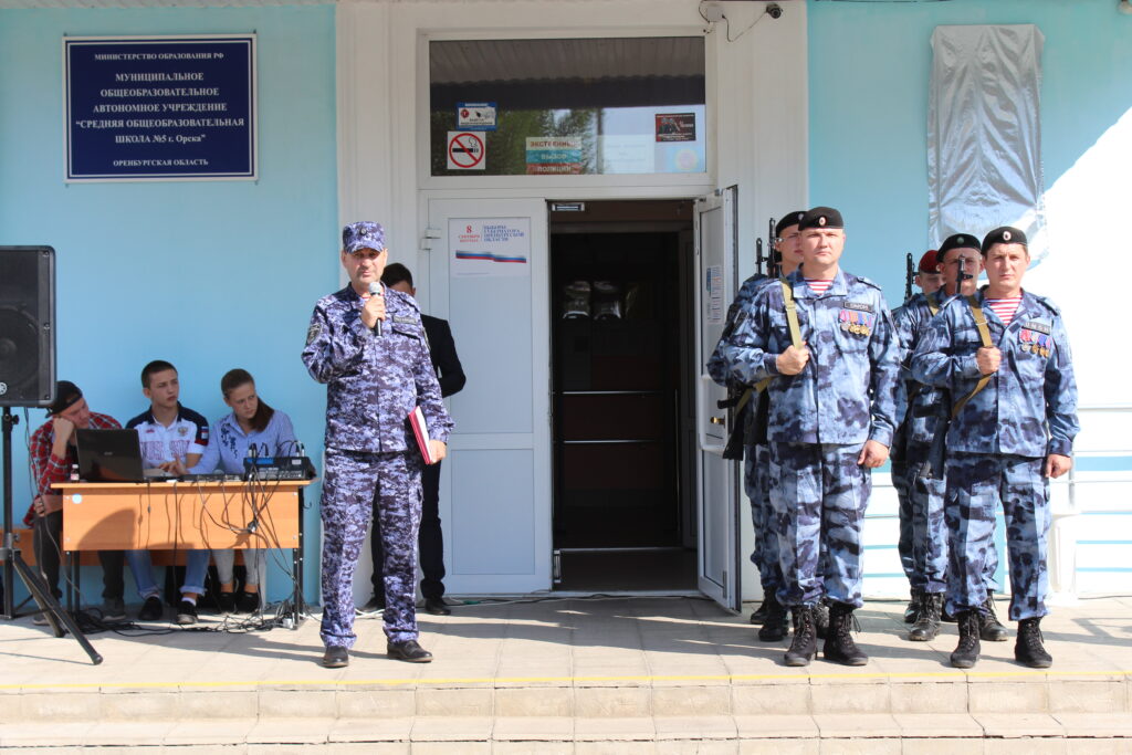 Личный состав вневедомственной охраны и оперативной роты ОМОН Росгвардии выстроился в почетном карауле. Полковник Олег Старовойтов от лица всего личного состава Управления Росгвардии по Оренбургской области, поздравил жителей города и школьников со знаменательным событием.