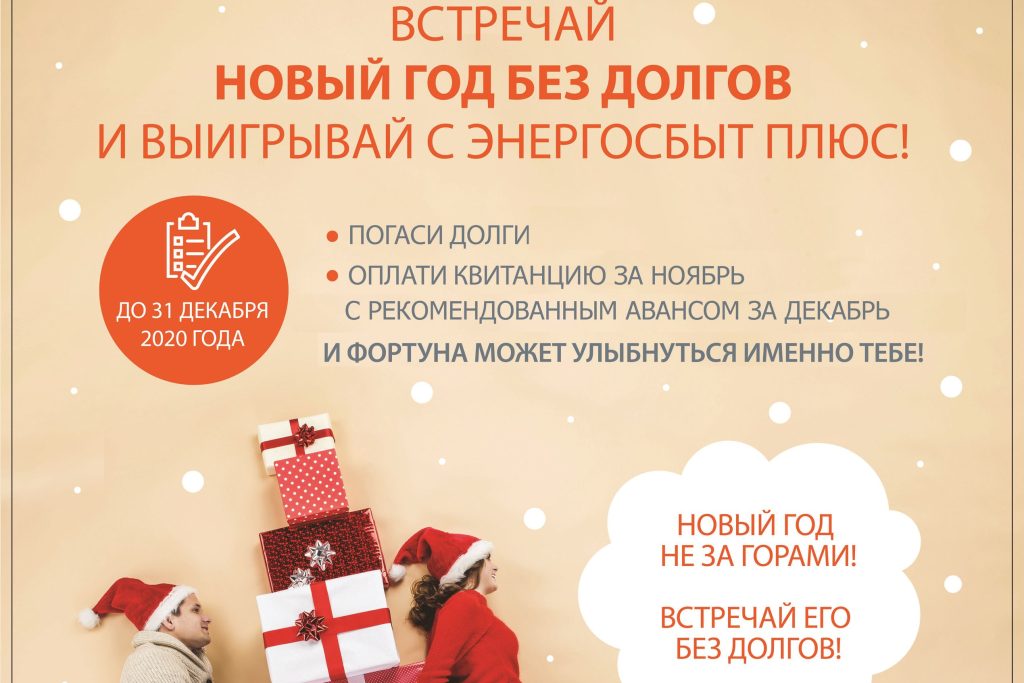 Оренбургский филиал «ЭнергосбыТ Плюс» продолжает традиционную акцию «В Новый год – без долгов!». В этом году призом за добросовестное отношение к оплате коммунальных услуг станет авансовая сумма на лицевой счёт – от 1 до 3 тысяч рублей, которые выиграют 100 счастливчиков.