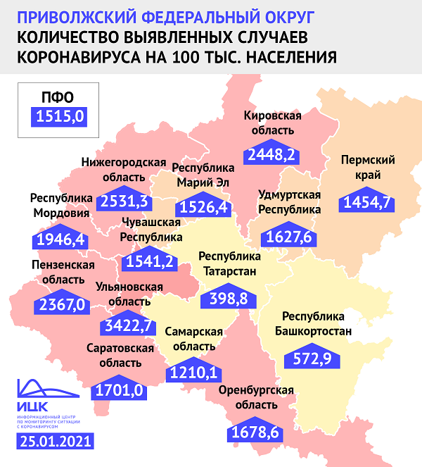 Наиболее высокие значения зарегистрированы в Ульяновской области — 3 422,7, в Нижегородской области — 2 531,3, в Кировской области – 2 448,2 заболевших на 100 тыс. жителей. В Поволжье среднее значение заболеваемости составляет 1 515 человек на 100 тысяч населения.