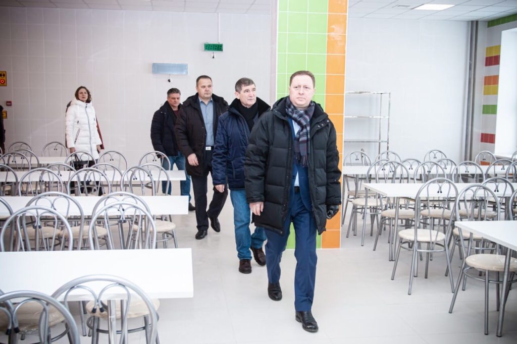 Министр осмотрел актовый и спортивный залы, пищеблок, школьные классы, санузлы, подсобные помещения, затем провел совещание, на котором обсудили дальнейший ход работ.