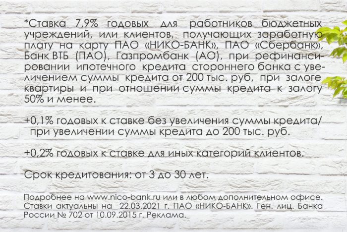 Рефинансируйте ипотеку стороннего банка в НИКО-БАНК по ставке от 7,9 % годовых на срок от 3 до 30 лет. Это удобно и выгодно — ведь Вы не только оплачиваете единым платежом все кредиты, но и снижаете свою кредитную нагрузку. Программа позволяет дополнительно взять денежные средства по той же ставке на любые цели. И все это без страховок и комиссий!