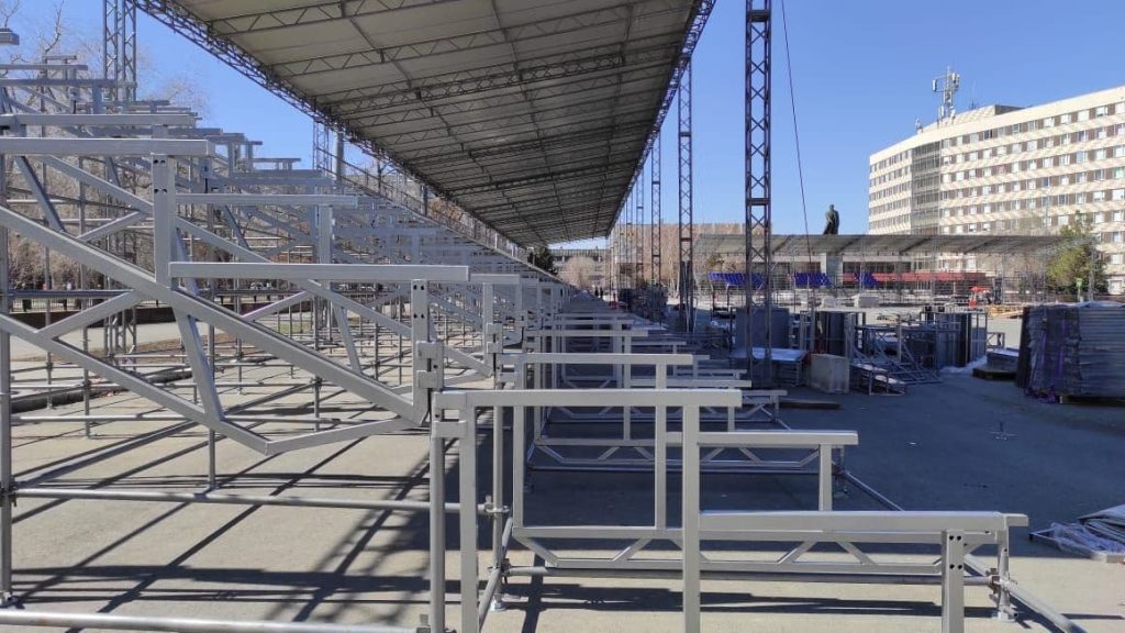 Работы по монтажу конструкций к 9 Мая на площади Ленина начались еще в марте. Там до сих пор работает спецтехника и устанавливают трибуны. Доступ к площади открыт, однако проведение массовой акции затруднительно. Проведение митинга на площади вызвало вопросы даже у ряда сторонников.
