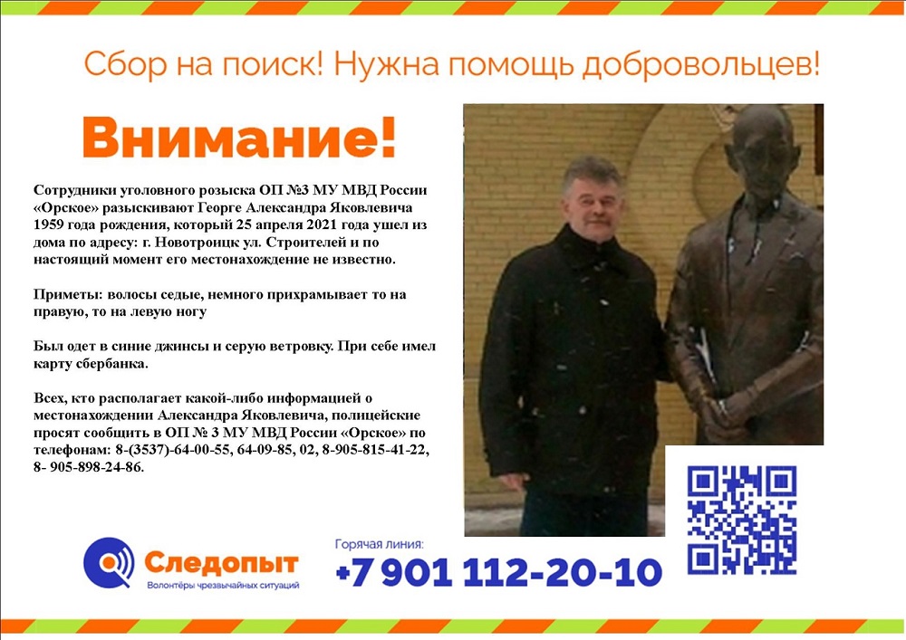 Всех, кто что-либо знает о местонахождении Александра Георге или видел его, просят позвонить по телефонам в ОП № 3 МУ МВД России «Орское»: 8-(3537)-64-00-55, 64-09-85, 02, 8-905-815-41-22, 8-905-898-24-86 или на горячую линию поискового отряда «Следопыт» — +7901112-20-10.