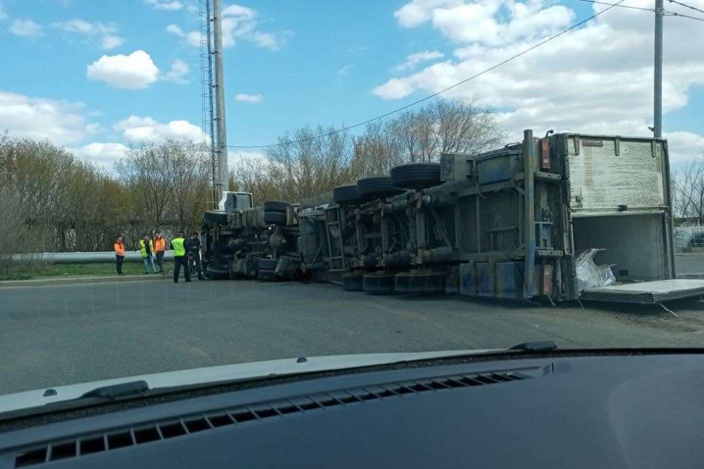 Дорожное происшествие случилось на улице Терешковой Оренбурга. Неподалеку от виадука объездной дороги фура с прицепом опрокинулась поперек проезжей части.