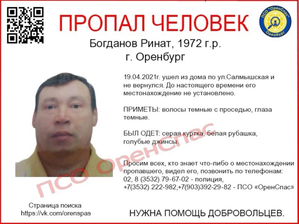 Ринат Богданов 1972 года рождения пропал 19 апреля 2021 года. Мужчина ушёл из дома по улице Салмышской и перестал выходить на связь с родными. Родственники заявили в полицию. Оренбуржец был объявлен в розыск.