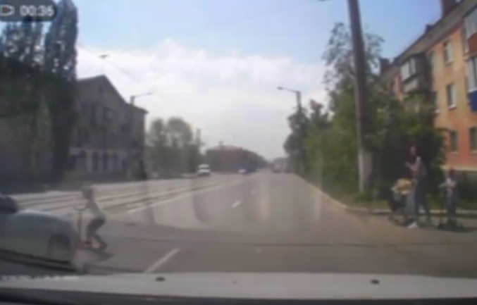 На записи видно, что на прилегающей дороге стоит мама с двумя детьми на самокатах и с коляской. Неожиданно девочка выезжает перед автомобилем на проезжую часть. Водитель, двигавшийся по правому ряду успел остановиться, автомобиль, двигавшийся левее, сбил ребенка.