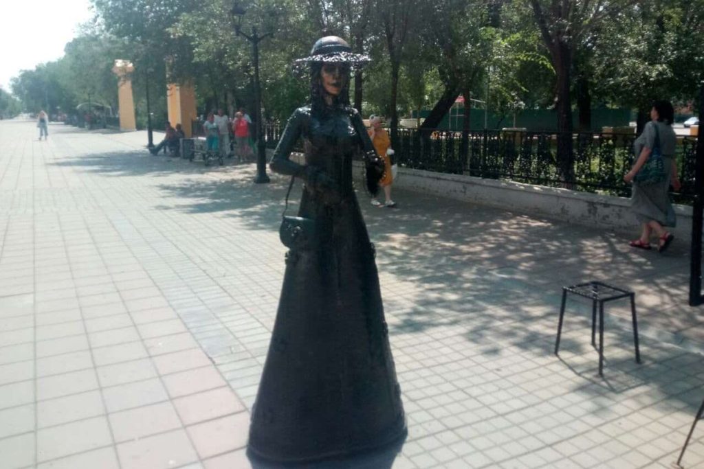 Одна из фигур декоративной композиции на улице Советской осталась без аксессуара. Из руки дамы, позирующей художнику, исчез зонтик.