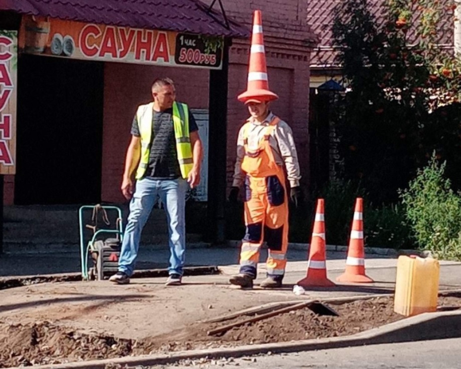 В жару на солнцепеке мужчина надел на голову оранжевый дорожный конус. В таком наряде он общался со своим коллегой.