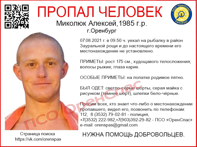 Всех, кто что-либо знает о местонахождении Алексея или видел его, просят позвонить по телефонам: 112, 8 (3532) 79-02-81 — полиция, +7(3532) 222-982,+7(903)392-29-82 — ПСО «ОренСпас» e-mail: orenspas@gmail.com
