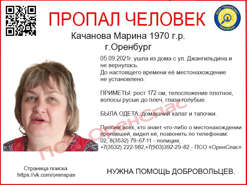 Сотрудники полиции и волонтёры ПСО «ОренСпас» разыскивают без вести пропавшую Марину Качанову.