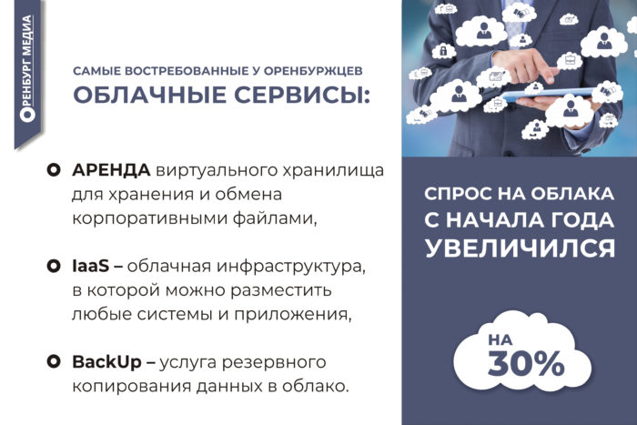 Как рассказал директор МТС в Оренбуржье Алексей Баштовой, облака являются сейчас одним из самых востребованных цифровых сервисов. За первые шесть месяцев 2021 года спрос на них увеличился по сравнению с аналогичным периодом прошлого года почти на треть, причем чаще всего обращались за услугой производственные компании и ритейлеры. Самыми востребованными услугами среди оренбургских клиентов облачных сервисов являются аренда виртуального хранилища для хранения и обмена корпоративными файлами, IaaS – облачная инфраструктура, в которой можно разместить любые системы и приложения, а также услуга резервного копирования данных в облако (BackUp).