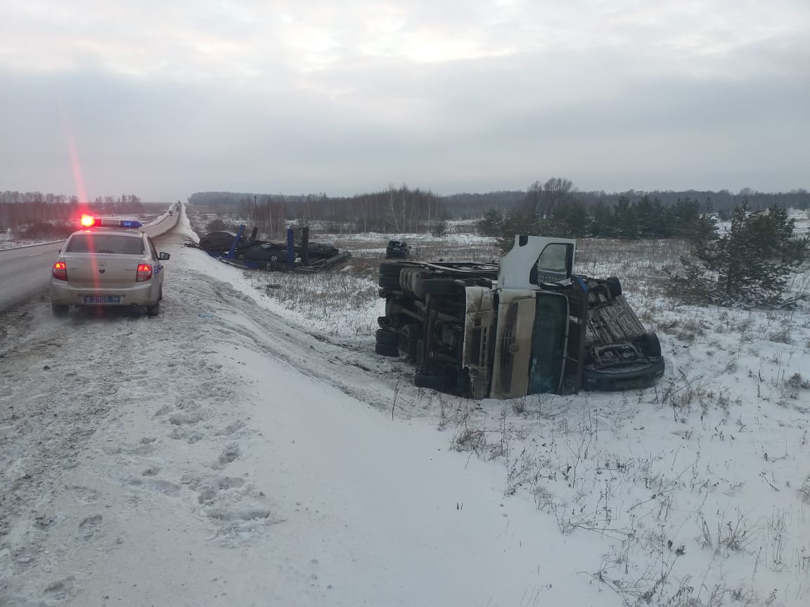 Расколотил 8 иномарок. На оренбургской трассе опрокинулся автовоз
