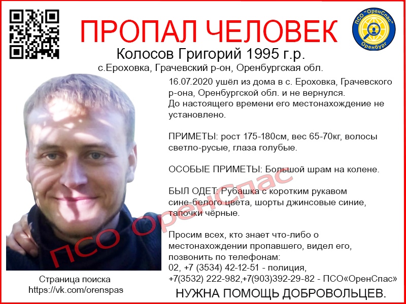 В Оренбуржье ищут без вести пропавшего 24-летнего Григория Колосова Редакция Оренбург Медиа - 25.07.2020