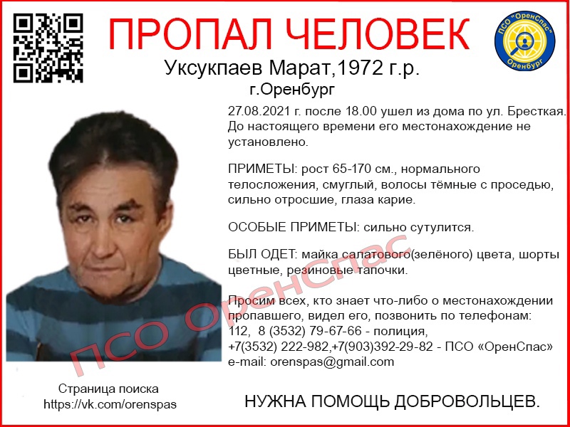 В Оренбурге разыскивают без вести пропавшего Марата Уксукпаева
