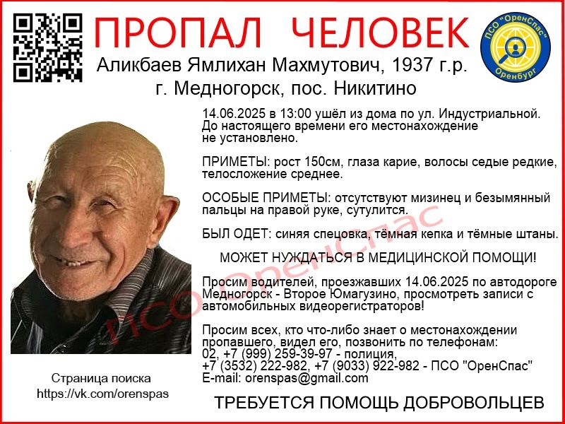 В Медногорске без вести пропал 88-летний пенсионер Редакция Оренбург Медиа - 17.06.2025 В Оренбургской области сотрудники полиции и волонтёры ПСО "ОренСпас" устанавливают местонахождение Ямлихана Аликбаева.