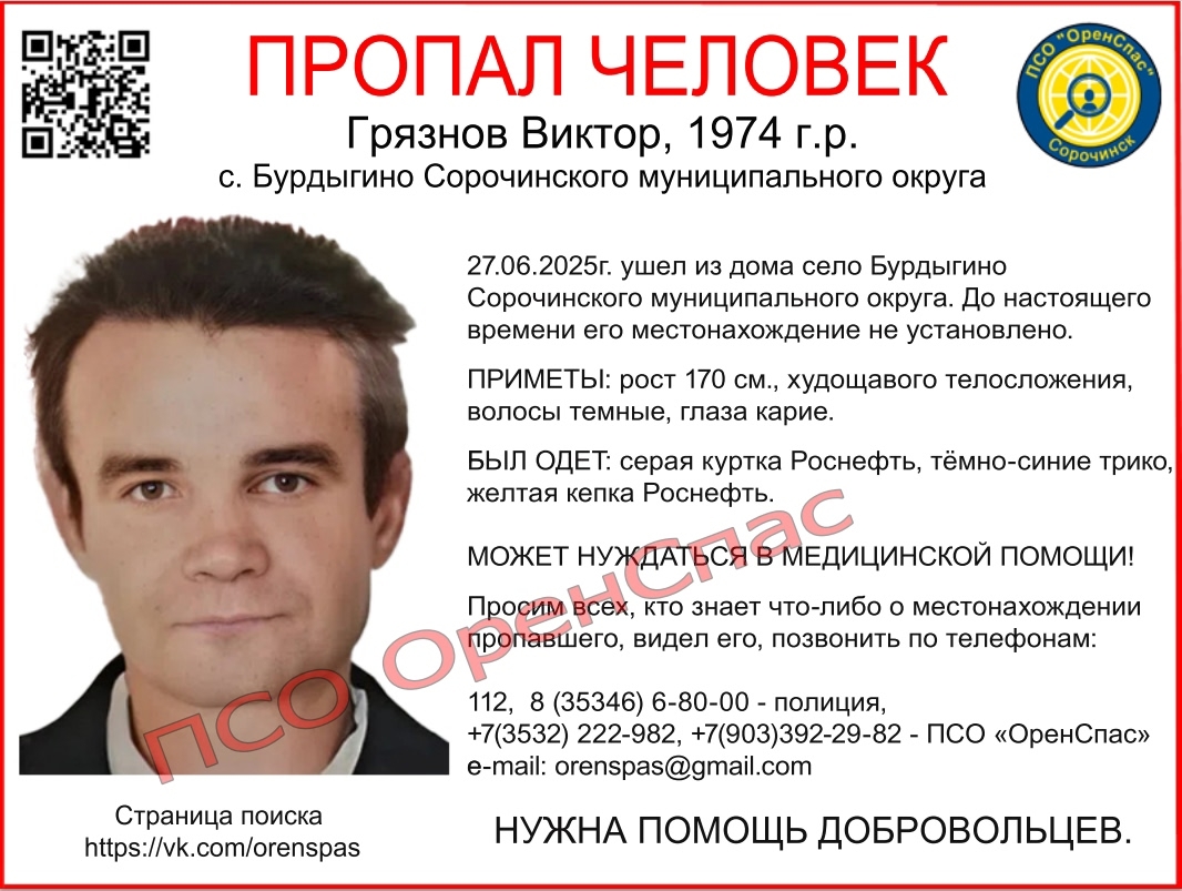 В Сорочинском округе летом пропал житель Бурдыгино Редакция Оренбург Медиа - 09.11.2025 В Оренбургской области сотрудники полиции и волонтёры ПСО " ОренСпас" разыскивают Виктора Грязнова 1974 года рождения.