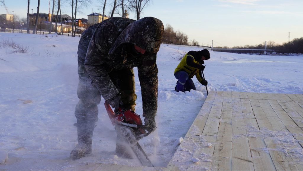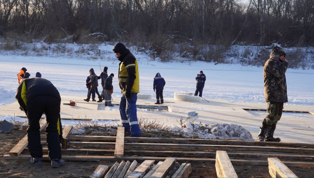 На Урале в районе автомобильного моста уже подготовили площадку. На ней расположат сразу две купели. Также смонтировали подходы к прорубям, параллельно обустраивают зону под палатки для переодевания.