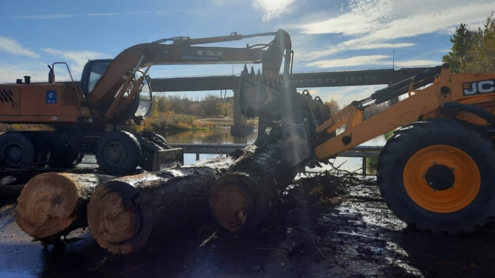 Специалисты при помощи спецтехники расчищают русло реки Самары. Весной этого года талые воды подмыли правый берег в районе низководного моста, что привело к обрушению части дорожного полотна.