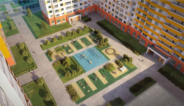 - Проектом предусмотрены спортивные и игровые площадки для жителей каждого дома.