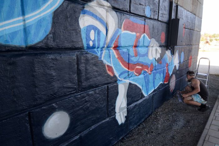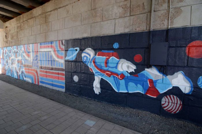— Для реализации проекта на одной из поверхностей мы выбрали изображение, узнаваемое для каждого оренбуржца – Юрий Гагарин в космосе. Три картины в стиле «авангард» объединяются в общую композицию – покорение космического пространства человеком. Художник начинает с предметного изображения – космонавта, переходя в более сложную абстрактную композицию, олицетворяющую другие измерения, пространства вселенной, — рассказала главный художник Оренбурга Наталия Бровко.