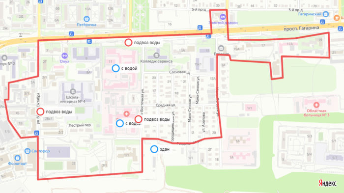 Котельные и ЦТП в зоне отключения отсутствуют. Подвоз воды абонентам будет осуществляться по адресам: пр. Гагарина, 11; ул. Мало-Восточная, 1а; ул. 60 лет Октября, 2б, а также по заявкам потребителей.