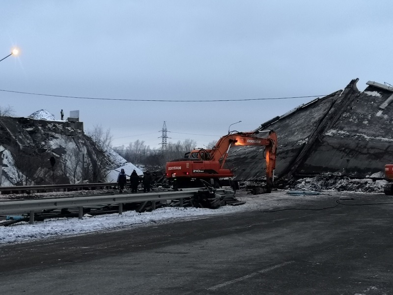 Завалы начали разбирать в 16.30 3 декабря. Через сутки специалистам удалось полностью опустить балки пролетного строения на дорогу и приступить к активному разбору конструкции.