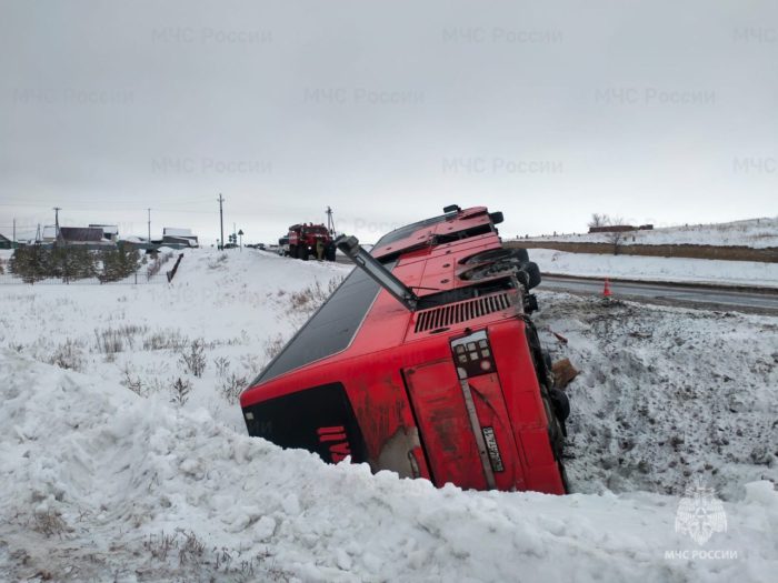 Серьезное ДТП произошло на участке трассы Оренбург-Казань в районе села Татарская Каргала. Рейсовый пассажирский автобус съехал в кювет и опрокинулся на бок.