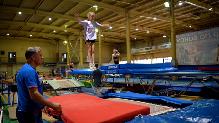 — Прыжки на батуте – это сложный координационный вид спорта. Сейчас тут на ваших глазах прыгают пять мастеров спорта, все они в зале практически с 6 лет. Какие качества необходимы? В первую очередь, смелость. Первое задание для детей, которые приходят к нам – это забраться к тренеру на плечи и постоять. Если колени не сильно трясутся – значит смелый (смеется). Ну и что еще – растяжка, шпагаты, мосты — все это базовые элементы. Все качества, которые собираются по частям в разных видах спорта, у нас есть. Без смелости – не наберешь высоты. Координация же развивается до 11 лет, потом уже тяжело с ребенком заниматься, если мы говорим о званиях мастера спорта и чемпионов, — рассказал Сергей Троянов.