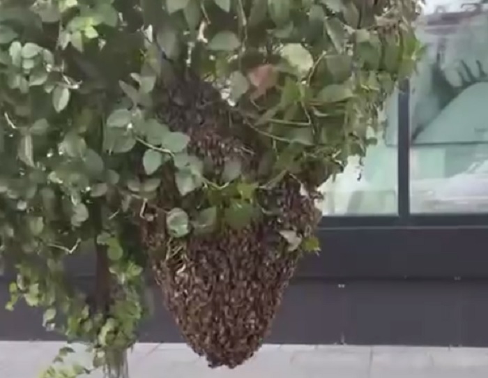 В центре Оренбурга неподалеку от входа в торговый центр «Восход» осы свили гнездо на дереве.