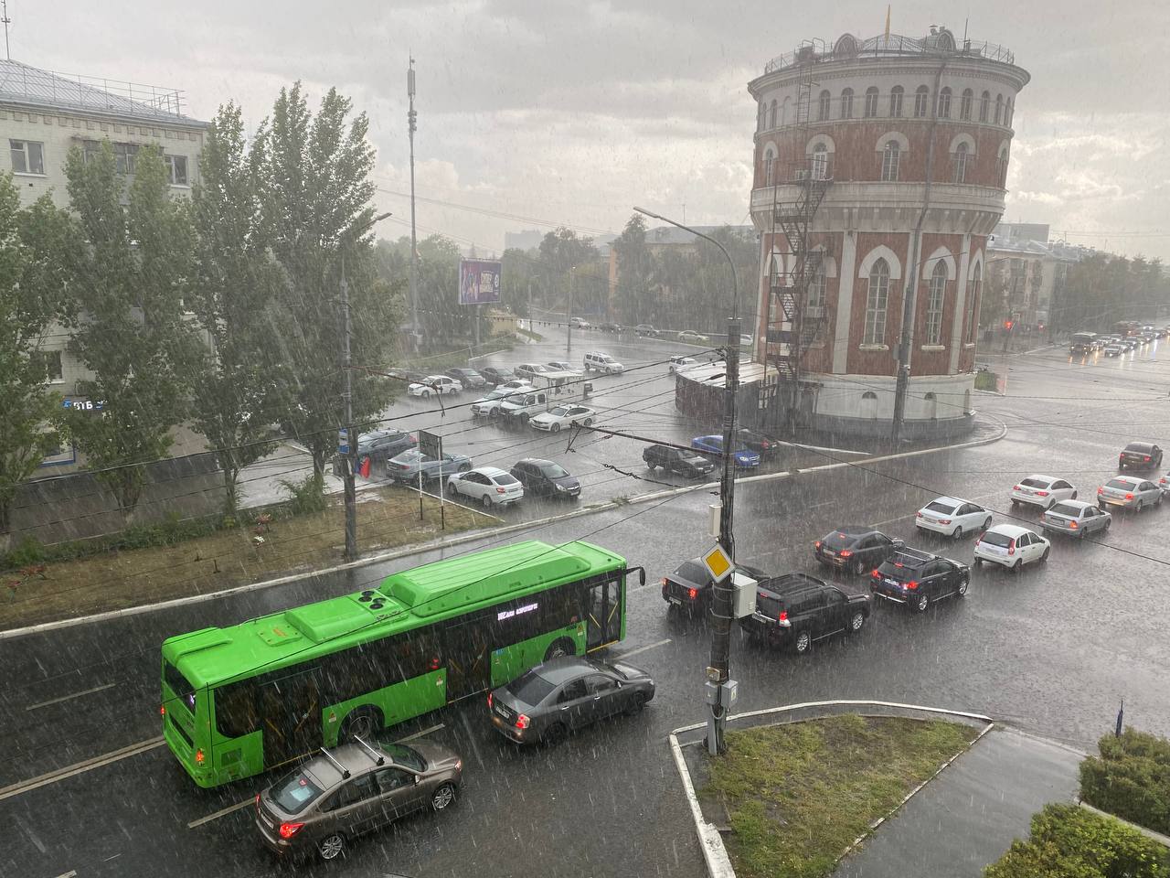 Около 16:00 тучи над городом сгустились. В центре города пошел мощный ливень с градом. Над Оренбургом гремит гром и сверкают молнии.