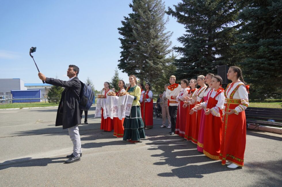 В аэропорту гостей приветствует Народный ансамбль «Игрицы» Оренбургского областного колледжа культуры и искусств.С народными песнями участников форума встречают на гостеприимной Оренбургской земле.