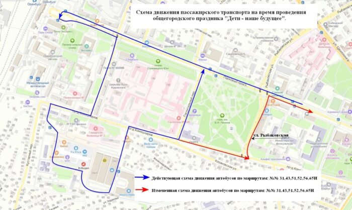 Также в указанный период маршруты пассажирского транспорта №№ 31, 43, 51, 52, 56, 65н с проезда Коммунаров будут поворачивать на улицу Рыбаковскую и далее следовать по своему обычному маршруту.