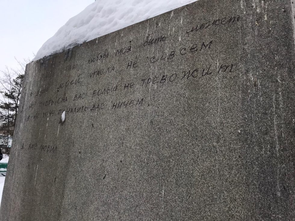 Неизвестные написали на постаменте маркером строки из стихотворения поэта «Я вас любил…». Надписи уже пытались смыть, но не смогли — на памятнике появились разводы.
