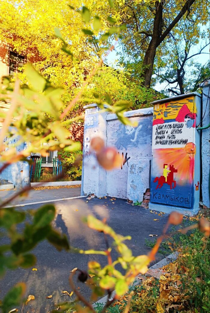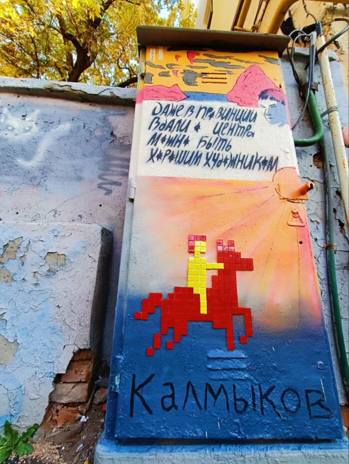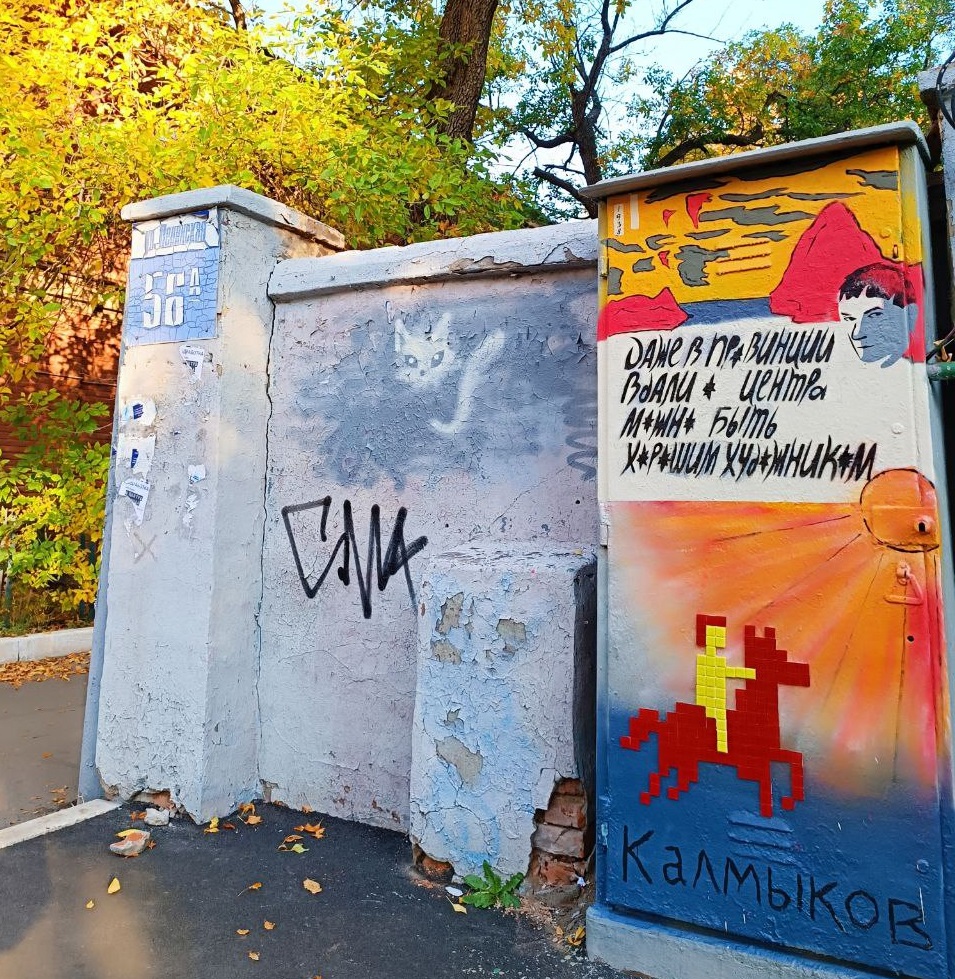 Анонимный автор с улиц Оренбурга «Жёлтый кубик» создал новый арт-объект на городских улицах. Панно из кубиков он посвятил художнику-авангардисту Сергею Калмыкову. Оно появилось на распределительном шкафу «Ростелекома» на ул. Ленинской, 56А.