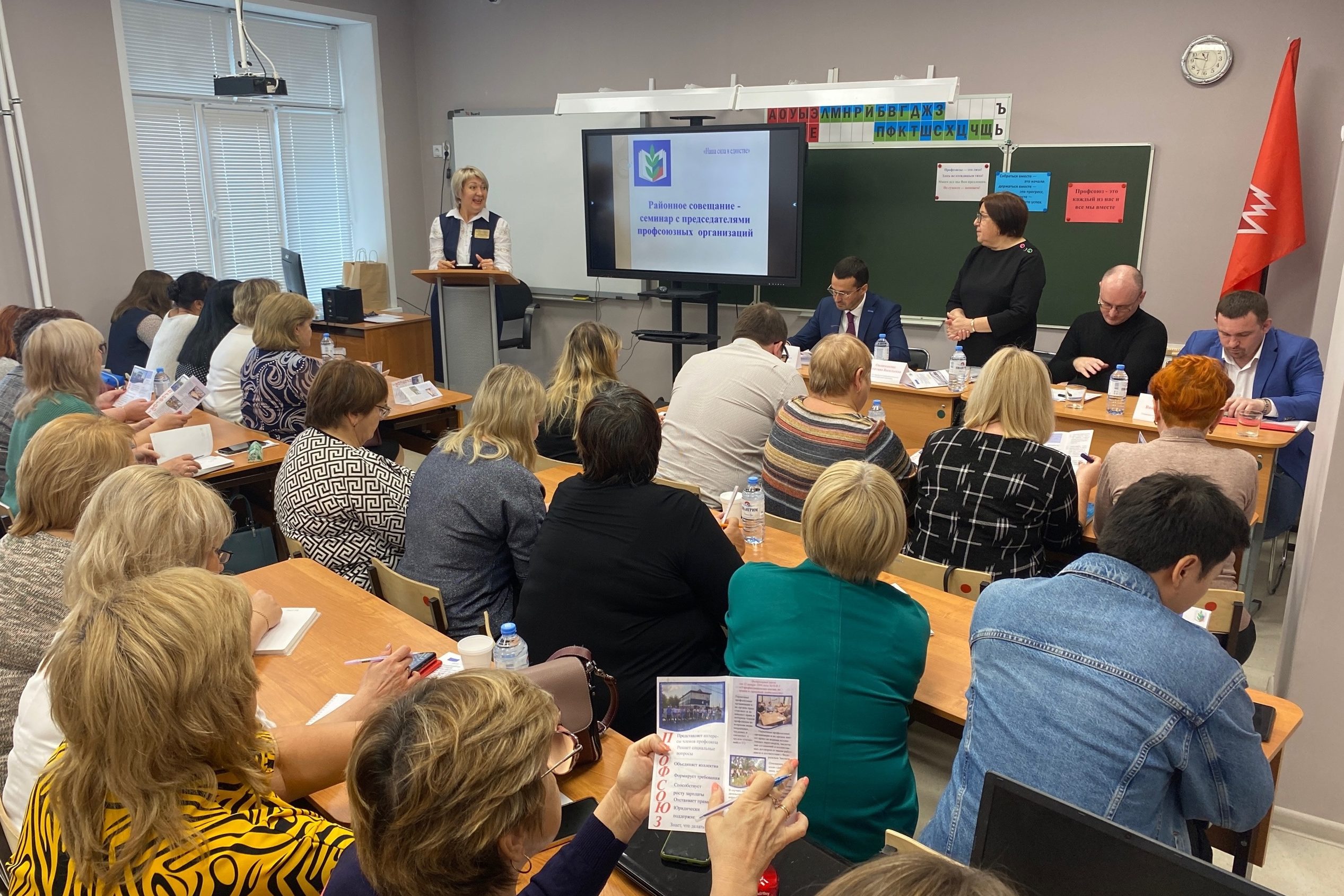Деловая часть районного семинара включила в себя анализ практики взаимодействия с администрациями образовательных учреждений, информационную работу в организациях, охрану труда и актуальные вопросы трудового законодательства.