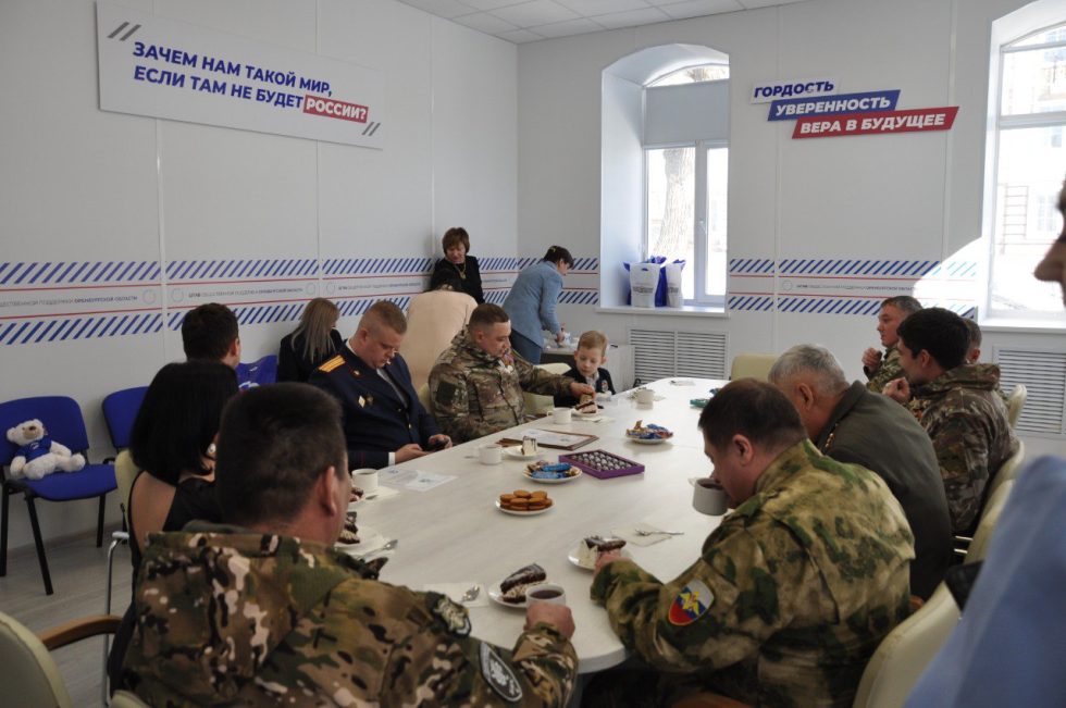 Для участников СВО было организовано чаепитие, за которым все собравшиеся обсудили меры соцподдержки военнослужащих.