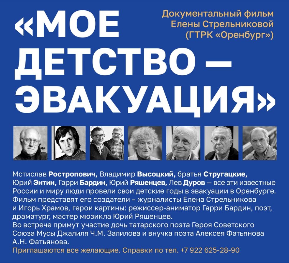 Также состоится творческая встреча с создателями фильма и обсуждением документальной ленты «Мое детство – эвакуация», сообщили в благотворительном фонде «Евразия»