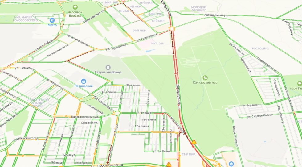 В Оренбурге на Загородном шоссе образовалась огромная пробка из-за ДТП и дорожных работ. Ситуацию с пробками в Оренбурге усугубляет плохая погода: идет дождь, многие дороги оказались под водой.