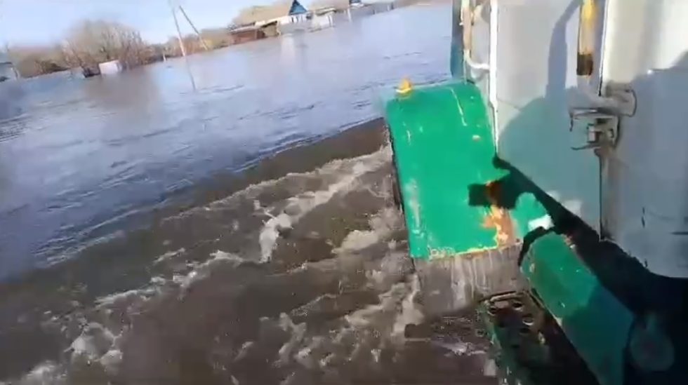 Жители села Ащебутак Домбаровского района Оренбургской области вынуждены спасаться от затопления на тракторах, почти уходящих под воду.