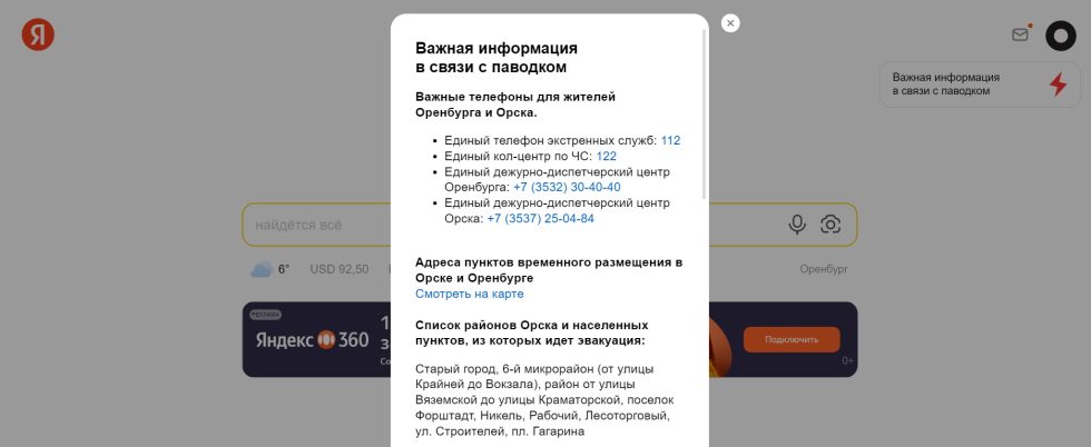 Яндекс и Минцифра Оренбургской области создали виджет о ситуации с паводком в регионе. Он доступен на главной странице Яндекса ya.ru.