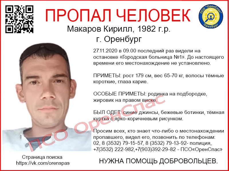 Кирилл Макаров 1982 года рождения пропал 27 ноября 2020 года в Оренбурге. В последний раз его видели около 9 часов утра на остановке «Городская больница №1». Поисковые мероприятия не дали результата. До настоящего времени местонахождение мужчины не установлено.