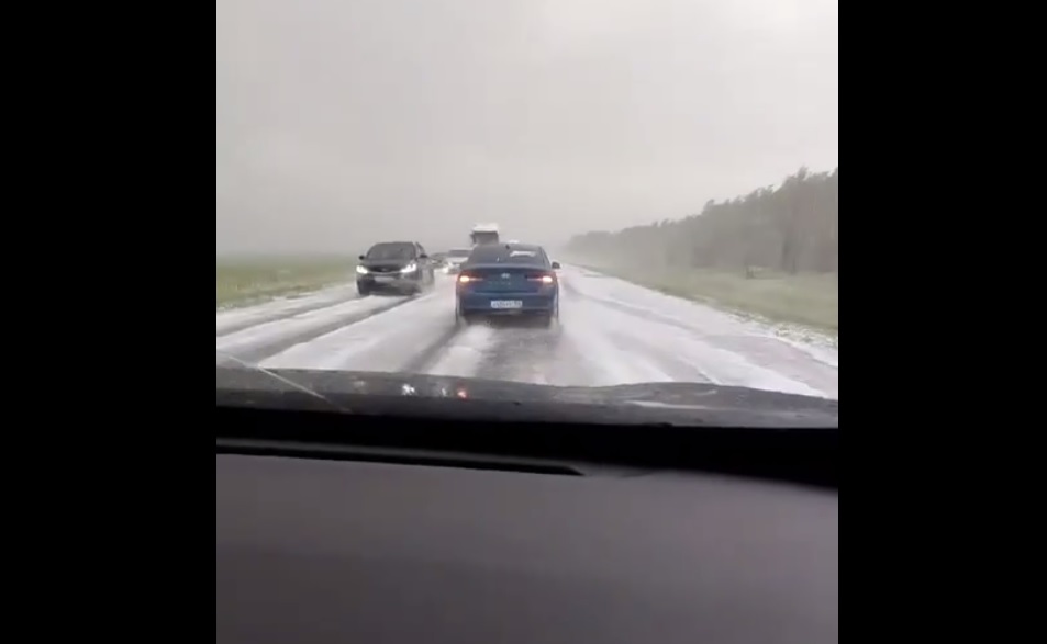 На трассе Оренбург-Самара автовладельцы во время мощного града двигаются на минимальной скорости и с включенными аварийками. Проезжая часть усыпана градинами, как снежным ковром. По итогу поездки автовладельцы обнаруживают на кузове сколы и царапины.