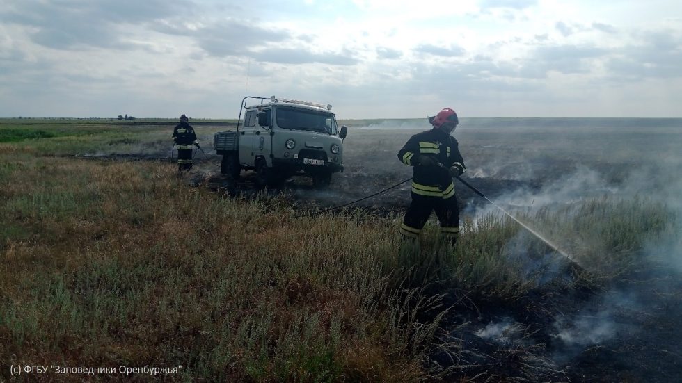 Пожар произошёл 21 июля в четырёх километрах от участка «Предуральская степь» Оренбургского заповедника.