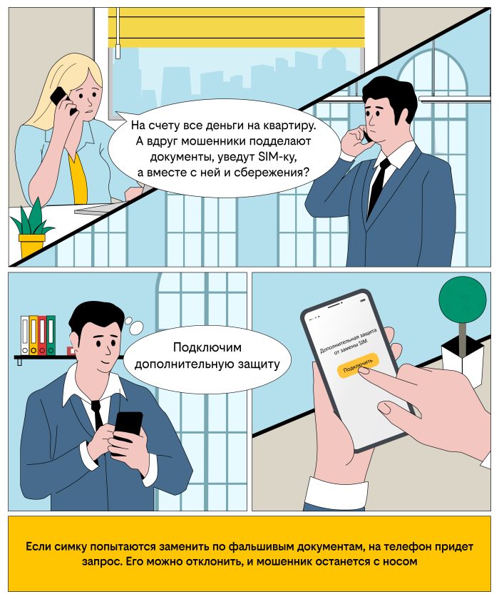 «Дополнительная защита от замены SIM» бесплатна для всех абонентов, позволяет заменить сим-карту только после предъявления кода, отправленного на электронную почту.