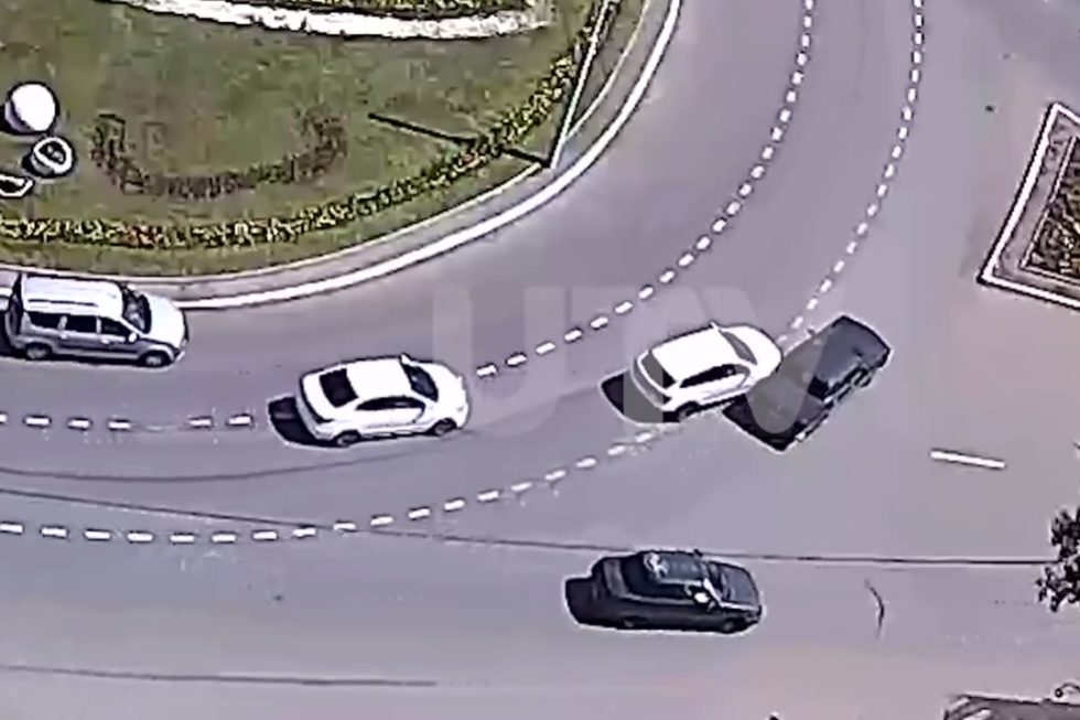 ДТП на кольце по проспекту Победы попало на запись камеры видеонаблюдения. На кадрах видно, что водитель белого автомобиля двигается по кольцу в сторону проезда Автоматики в среднем ряду. Параллельно в правом ряду ехал черный автомобиль.