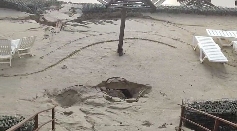 Пользователи социальных сетей публикуют фото и видео с провалами, которые возникли на пляже в Соль-Илецке Оренбургской области.